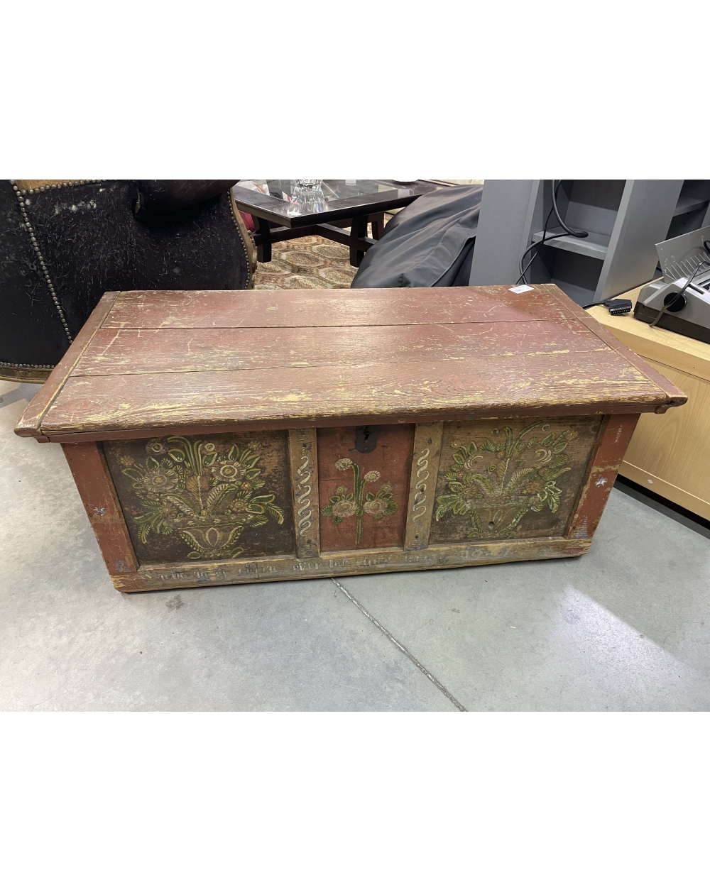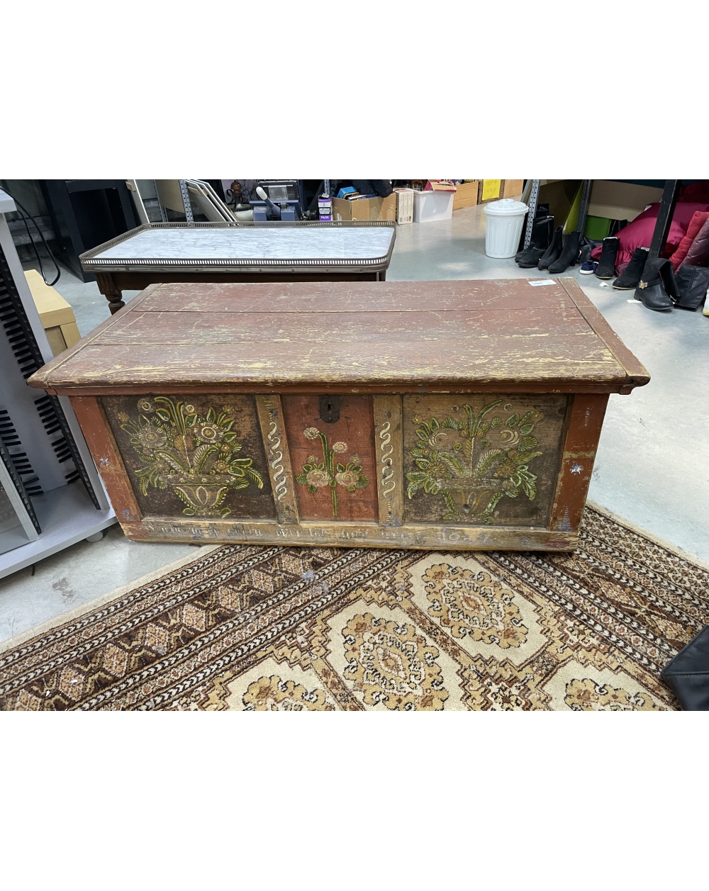 Découvrez l'histoire et le charme d'un passé lointain avec notre coffre de mariage du 19ème siècle. Ornée d'un décor floral délicat, cette pièce évoque l'élégance et la tradition d'autrefois. Fabriqué en bois de qualité, ce coffre est non seulement un bel objet décoratif, mais aussi un espace de rangement pratique pour vos trésors.