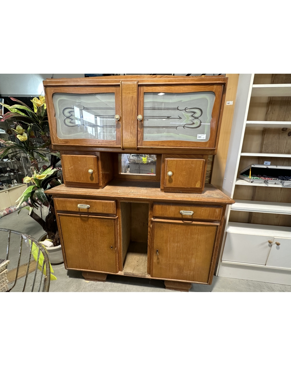 Vaisselier d’époque en bois qui offre de grands espaces de rangement avec plusieurs placards, vitrines et tiroirs.