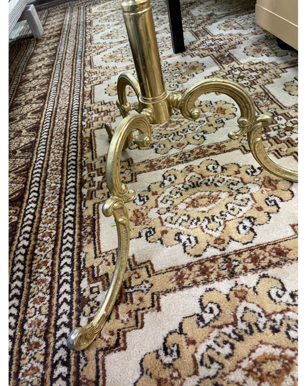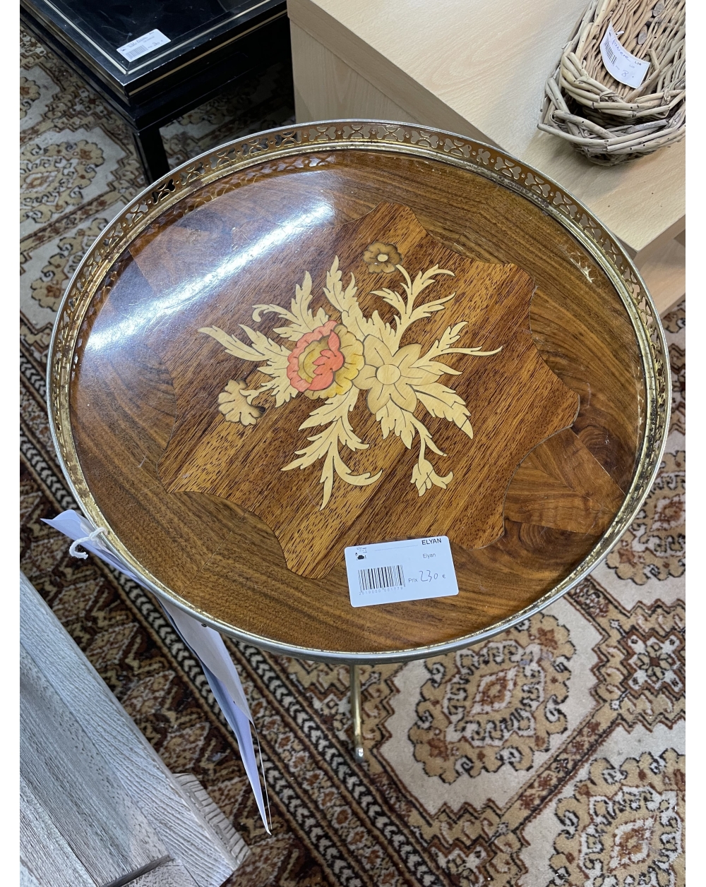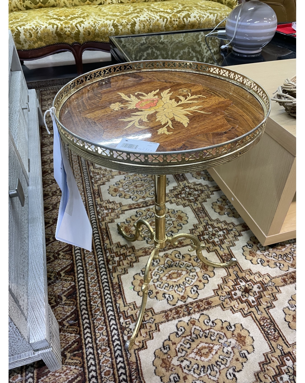 Cette petite table d'appoint vintage en laiton dispose d'un plateau en marqueterie dessinant une jolie pièce floral.